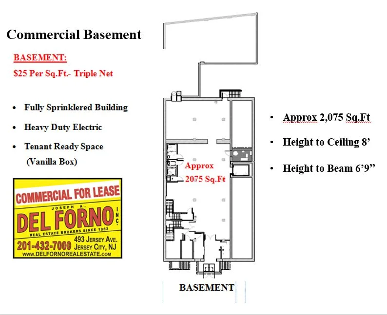 Commercial Basement available for lease in the VITO A. LOFTS. Prime Downtown Jersey City Commercial Basement for Lease – 2,075 SF | 2 Blocks from Grove PATH